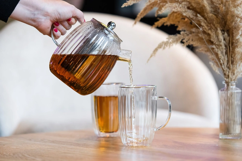 Dzbanek wykonany jest ręcznie z wysokiej jakości szkła borokrzemowego bezpiecznego dla zdrowia i niewchodzącego w kontakt z zawartością oraz niewpływającego na jej smak.