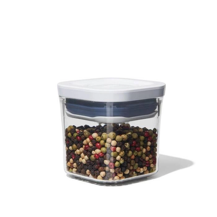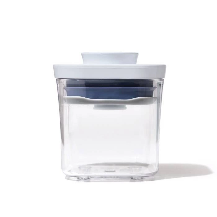 Pojemnik POP z kolekcji Good Grips marki OXO, - duża pojemność, do 0,2 l, - doskonały na ciastka, przekąski, płatki i sypką żywność, - o kwadratowej podstawie, - wygodne przesypywanie dzięki wygodnemu przyciskowi, - można go myć w zmywarce.