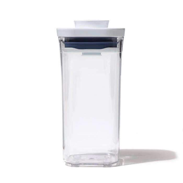 Pojemnik POP z kolekcji Good Grips marki OXO, - duża pojemność, do 0,5 l, - doskonały na ciastka, przekąski, płatki i sypką żywność, - o kwadratowej podstawie, - wygodne przesypywanie dzięki wygodnemu przyciskowi, - można go myć w zmywarce.
