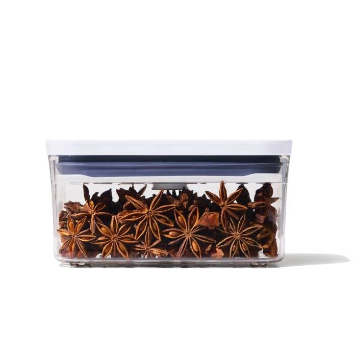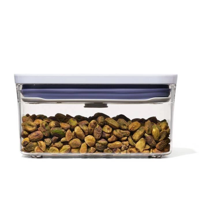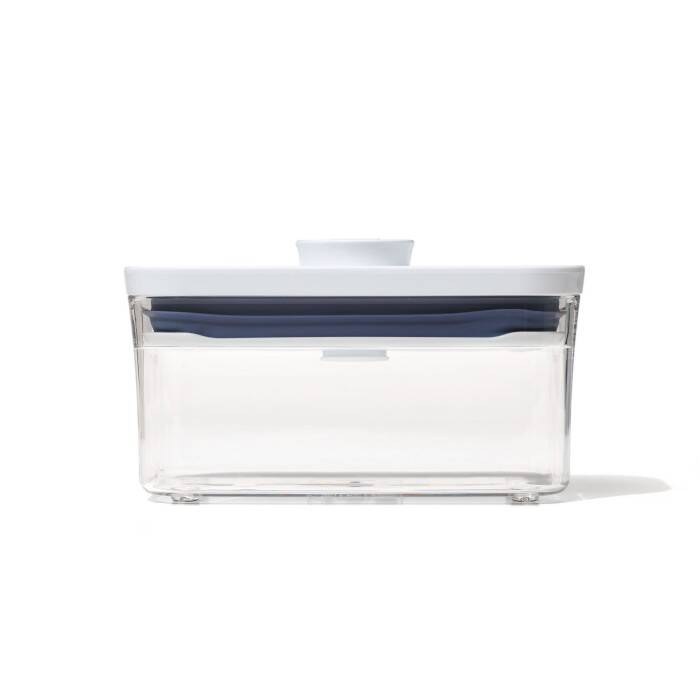 Pojemnik POP2 z kolekcjiGoodGrips marki OXO, - duża pojemność, do 0,12l., - doskonały na ciastka, przekąski, płatki i sypką żywność, - o prostokątnej podstawie, - wygodne przesypywanie dzięki wygodnemu przyciskowi, - można go myć w zmywarce.