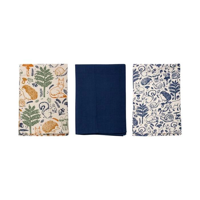 Zestaw 3 ściereczek kuchennych Woodland Price & Kensington: - 2 z nich mają leśne wzory, 1 jest granatowa z fakturą "waflową", - wykonane ze 100% bawełny, - można prać je w pralce.