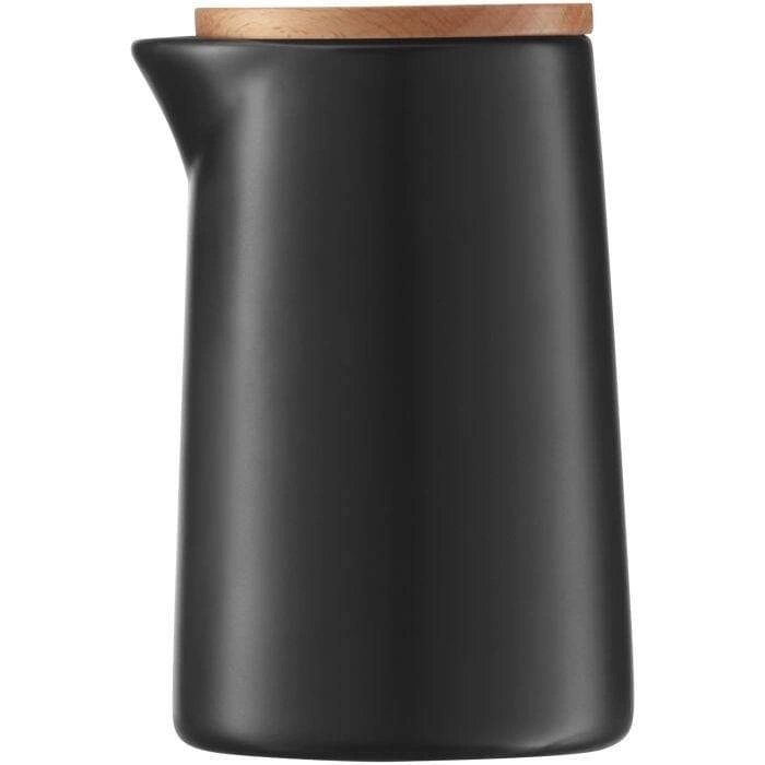 Mlecznik Kineo WMF: - w matowym, czarnym kolorze, - jest wykonany z kamionki, - ma ergonomiczną formę, - w komplecie drewniana pokrywka, - można myć go w zmywarce - bez pokrywki.