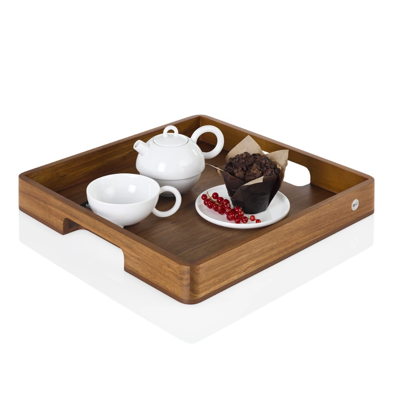 Elegancka taca z wykonana drewna akacji i orzechu. Taca pięknie prezentuje koloryt naturalnego drewna a wysokie boki skutecznie zabezpieczają transportowane naczynia. Taca z obu boków ma szerokie wycięcie umożliwiające przenoszenie. Dodatkowy komfort dają zaokrąglone krawędzie.