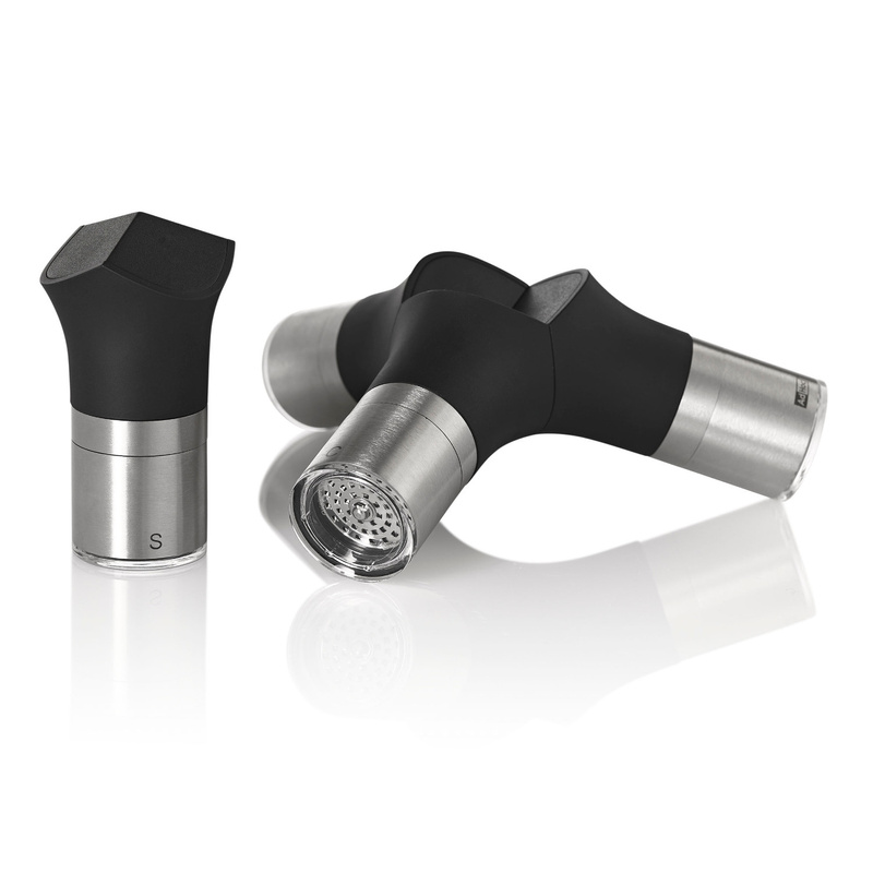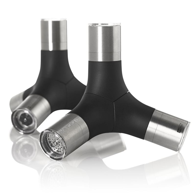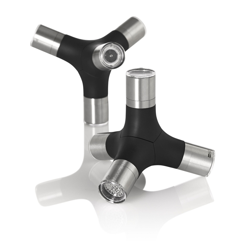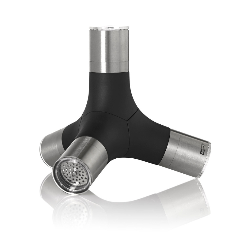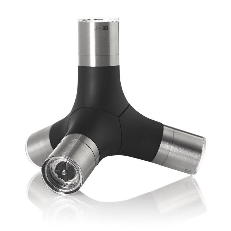 Trzy małe młynki i jeden krajacz do chili złączone mocnymi magnesami w jeden duży młynek to doskonałe połącznie funkcjonalności z ekscentrycznym designem.