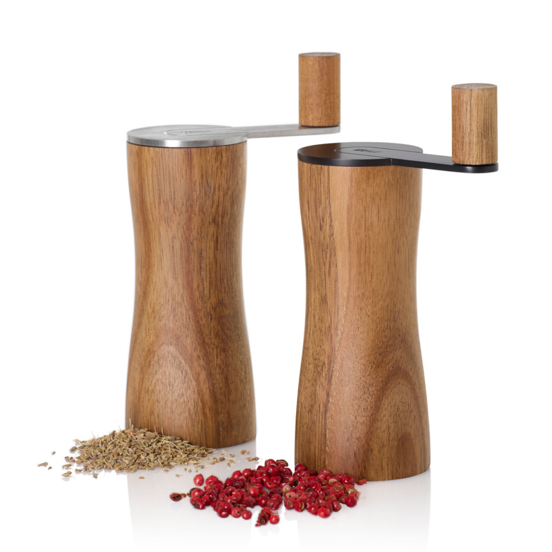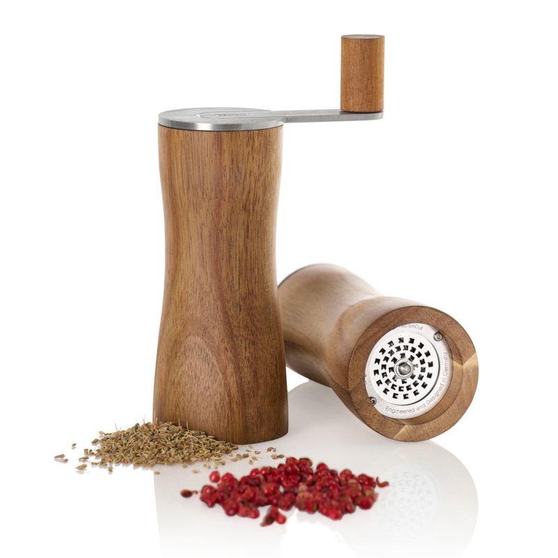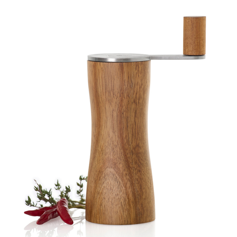 Ergonomiczna korbka sprawia, że mielenie jest praktycznie bez wysiłku, a naturalny opływowy kształt młynka dopasowuje się do dłoni.