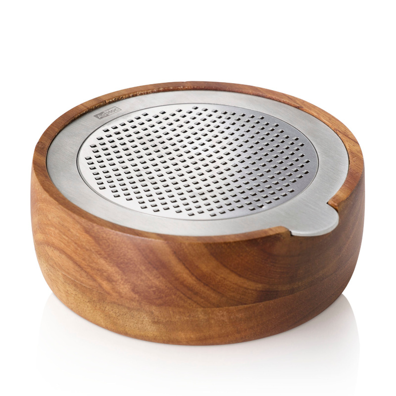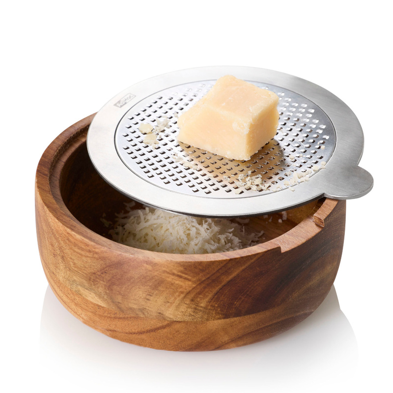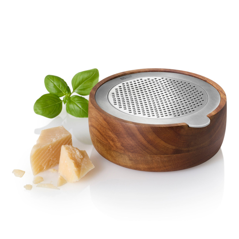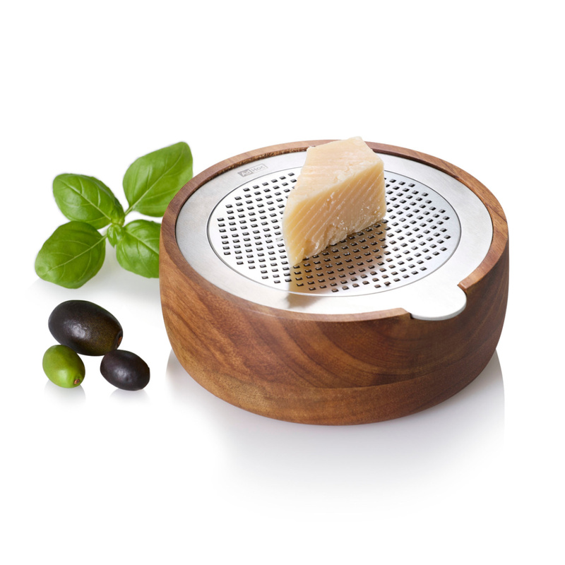 Miska z drewna akacjowego utrzymuje tarkę w miejscu a także daje możliwość eleganckiego zaserwowania.