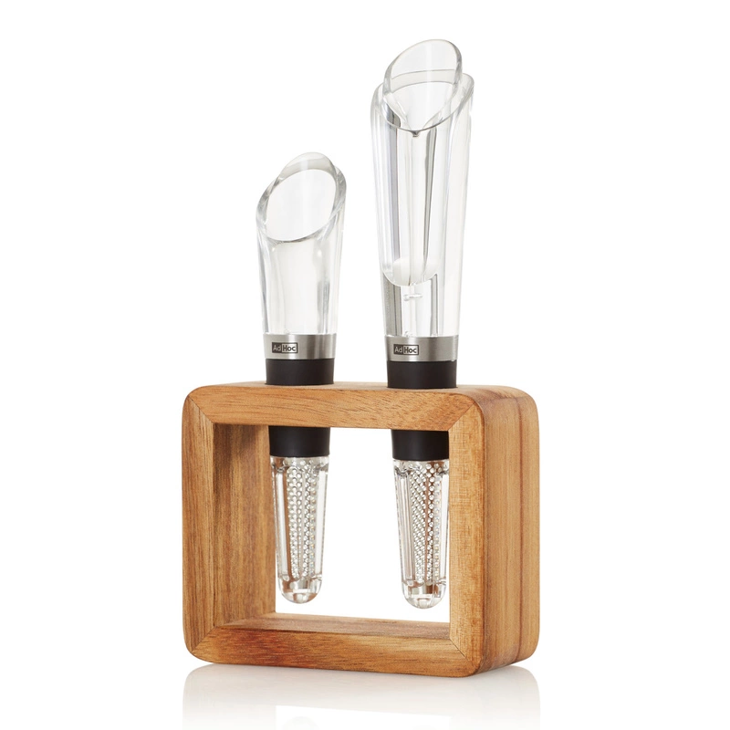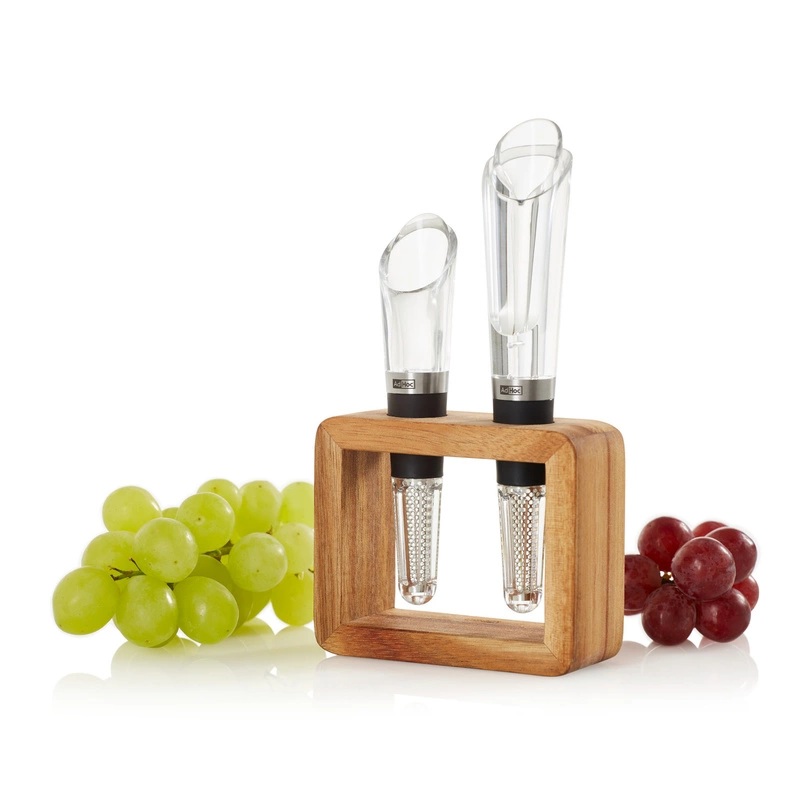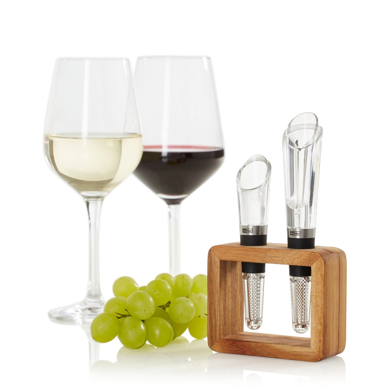 Zestaw składa się z aeratora do wina Airovin oraz nalewaka do wina z filtrem Vine umieszczonych w przykuwającej oko, wykonanej z wysokiej jakości drewna akacjowego podstawce.