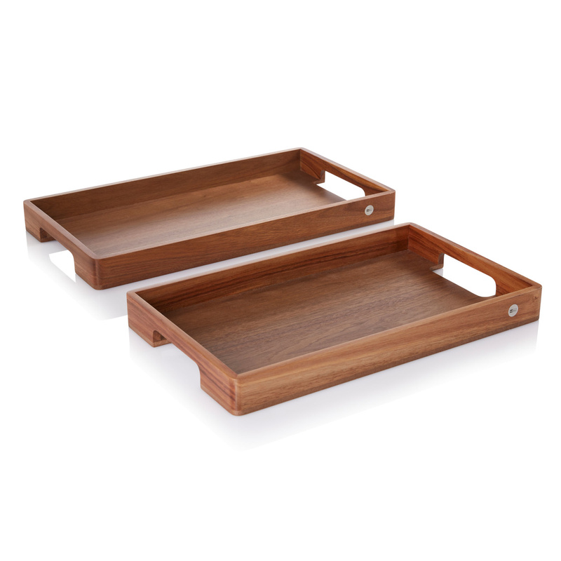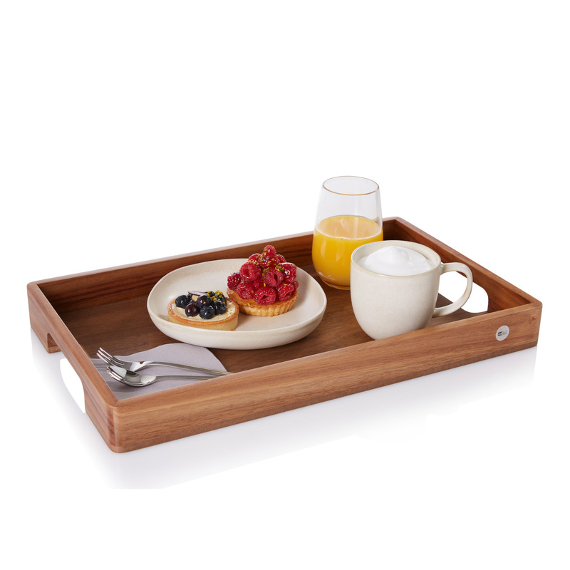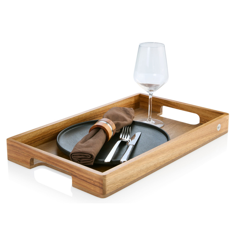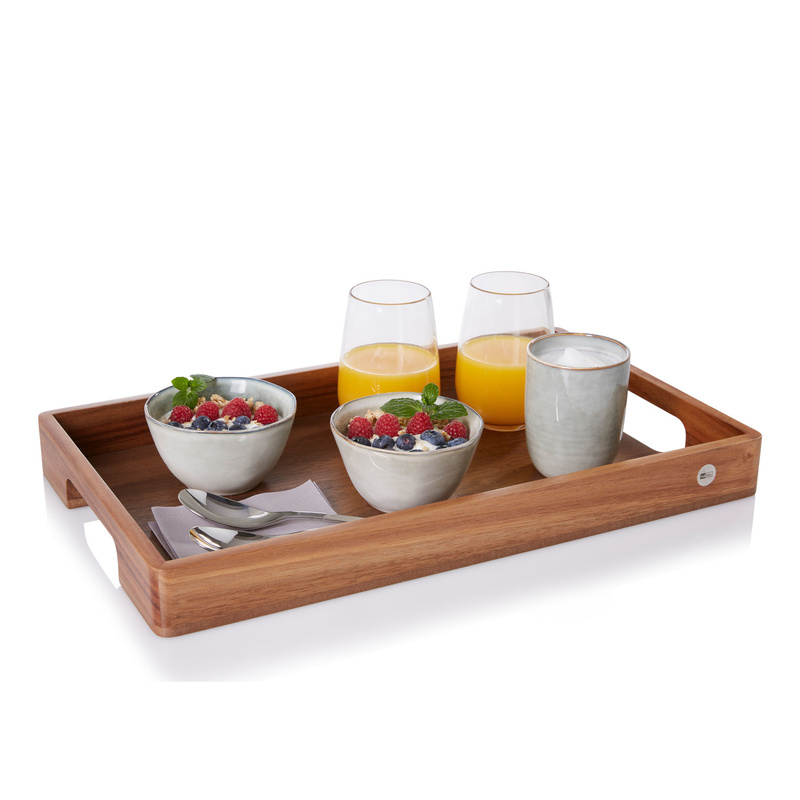 Taca pięknie prezentuje koloryt naturalnego drewna a wysokie boki skutecznie zabezpieczają transportowane naczynia.