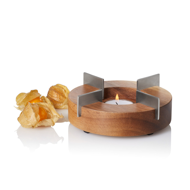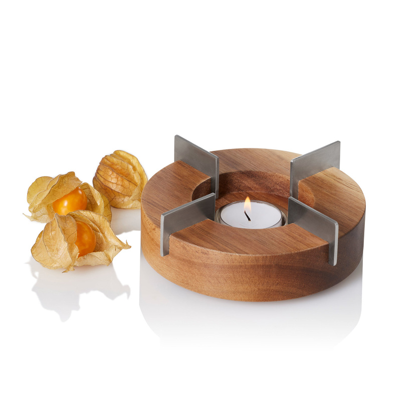 Połączenie drewna akacjowego ze szczotkowaną stalą nierdzewną nadaje podgrzewaczowi charakteru i elegancji.