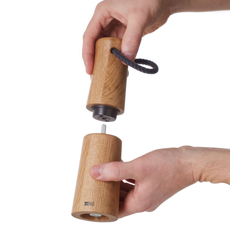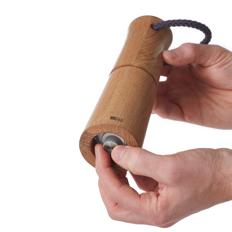 Młynek wykonany z olejowanego drewna dębowego, profilowana obudowa o zaokrąglonych krawędziach przyjemnie leży w dłoni.