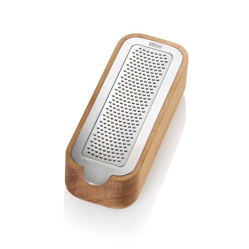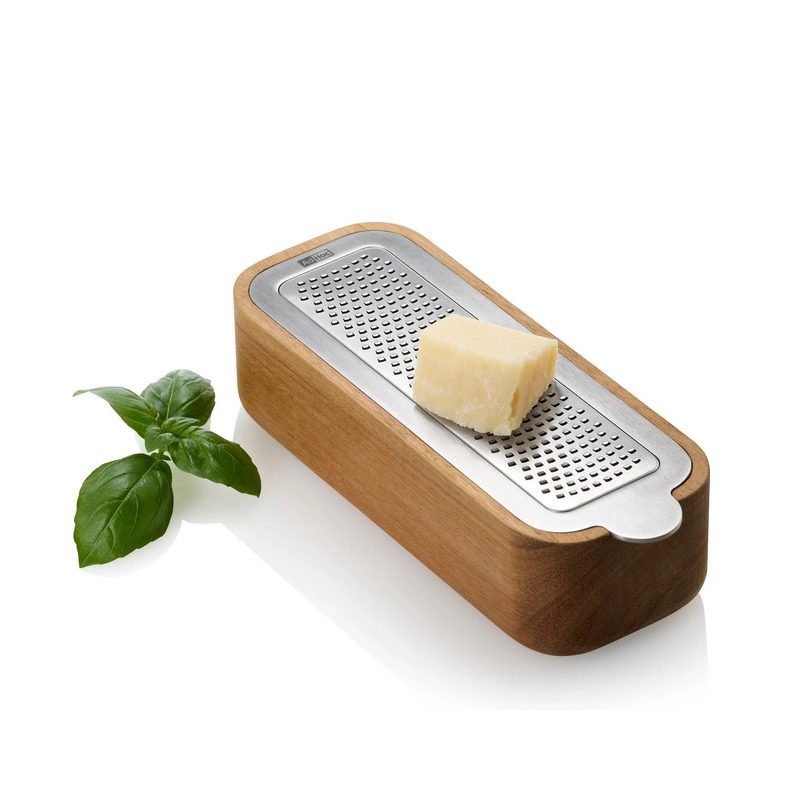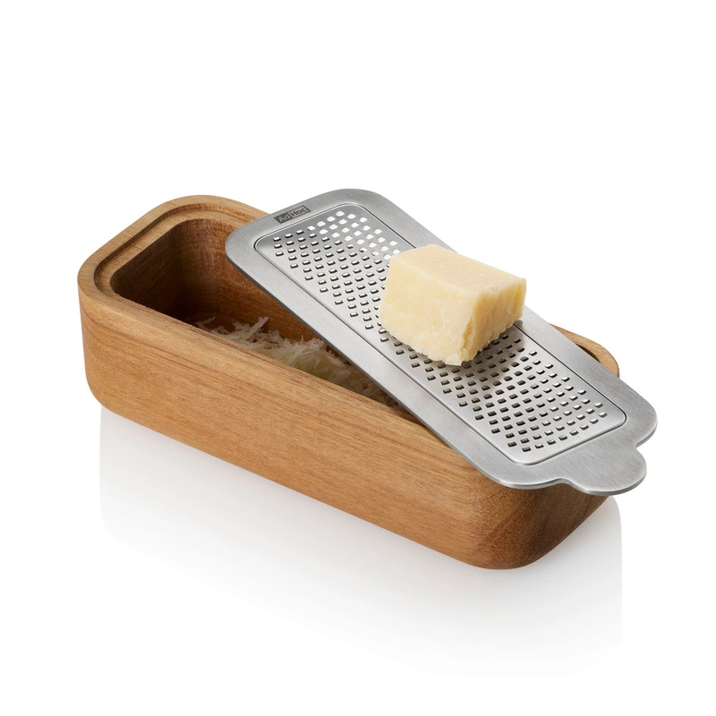 Miska z drewna akacjowego utrzymuje tarkę w miejscu a także daje możliwość eleganckiego zaserwowania.