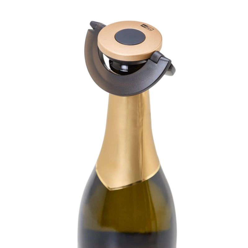 Korek do szampana Gusto czarno-złoty wyjątkowo niski i płaski, idealnie sprawdza się, kiedy trzeba przechować otwartą butelkę szampana w lodówce! Silikonową uszczelkę blokujesz na szyjce butelki za pomocą ruchomych półokręgów - uch, całkowicie ją uszczelniając.