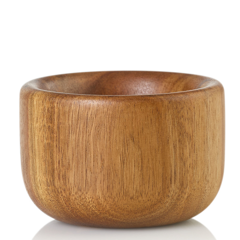 Miska została wykonana z antybakteryjnego drewna akacjowego, natomiast tłuczek z neutralnego smakowo granitu.
