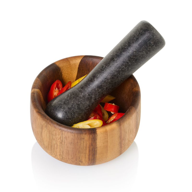 Miska została wykonana z antybakteryjnego drewna akacjowego, natomiast tłuczek z neutralnego smakowo granitu.