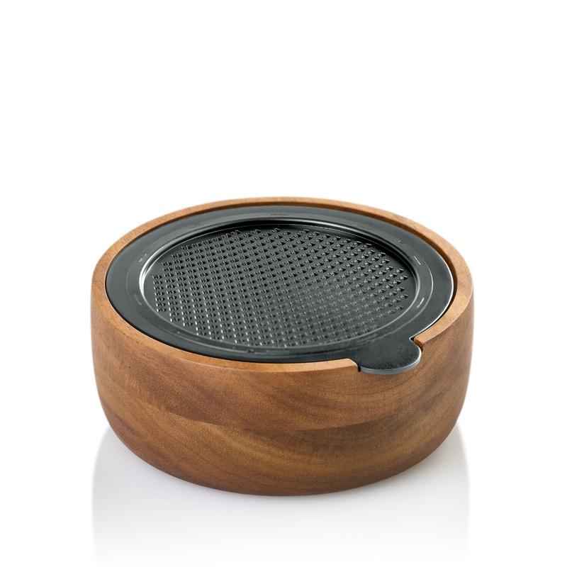 Akacjowa miska może posłużyć do serwowania startego produktu, a umieszczone na jej spodzie antypoślizgowe stopki zapewniają stabilność podczas tarcia.