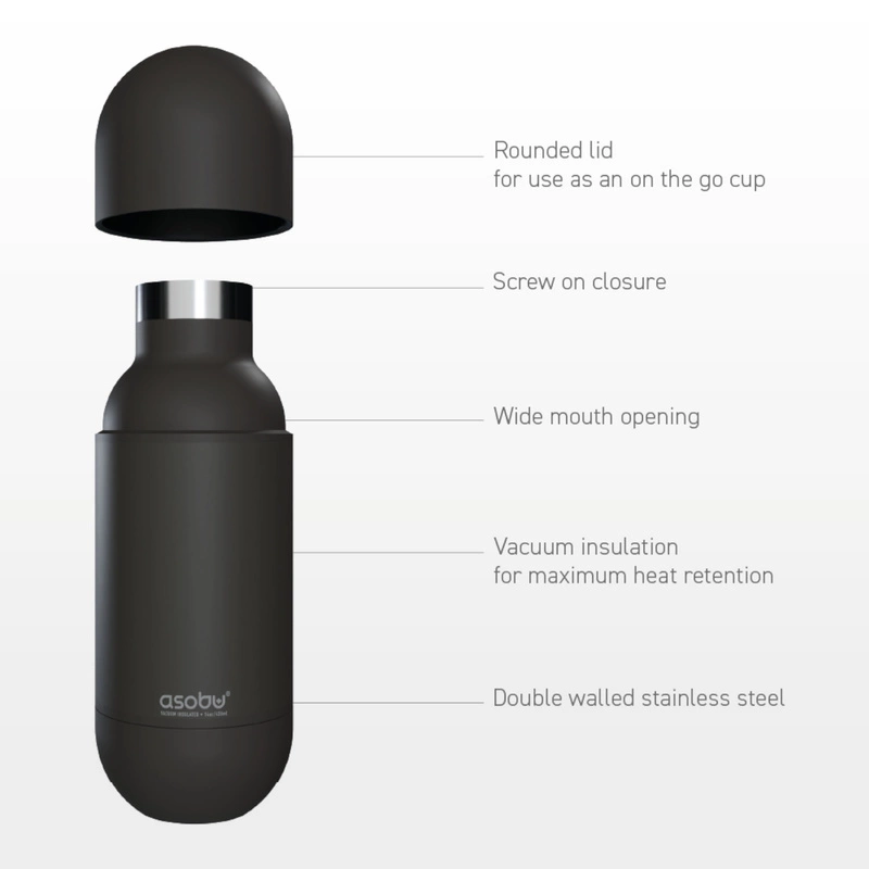 Butelka ASOBU z linii ORB o unikalnym obłym kształcie jest nie tylko eleganckim dodatkiem, ale przede wszystkim poręczną butelką termiczną, łatwą do przenoszenia z praktycznym kubkiem-zakrętką.