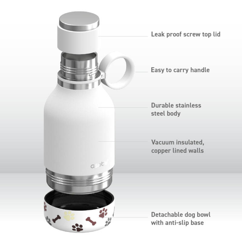 Izolowana próżniowo butelka ze stali nierdzewnej utrzymuje idealnie schłodzoną wodę przez wiele godzin, a odkręcana miska sprawia, że ??dzielenie się wodą z najlepszym przyjacielem jest proste i przyjemne.