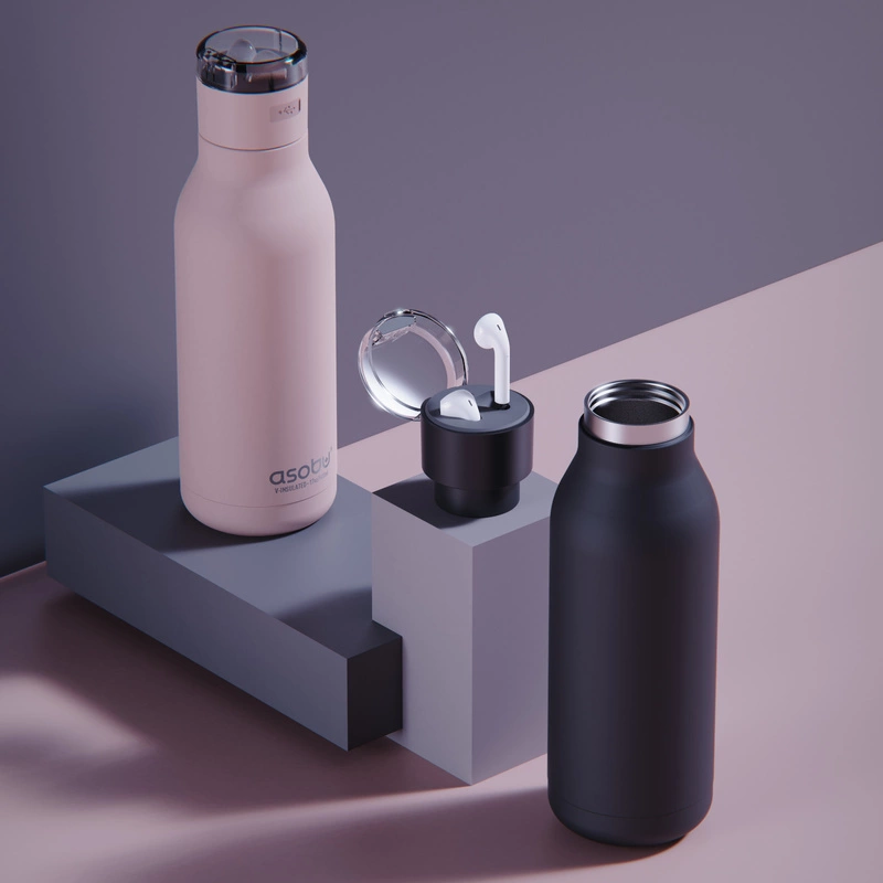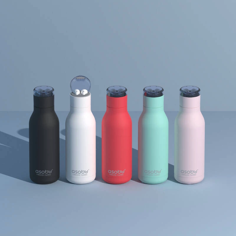 Stalowa butelka termiczna Asobu® H2 Audio z parą bezprzewodowych słuchawek dousznych z ładowarką ukrytą w zakrętce butelki.