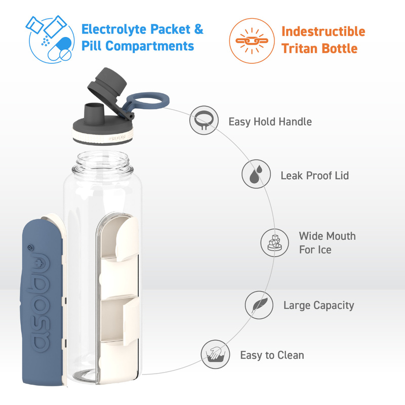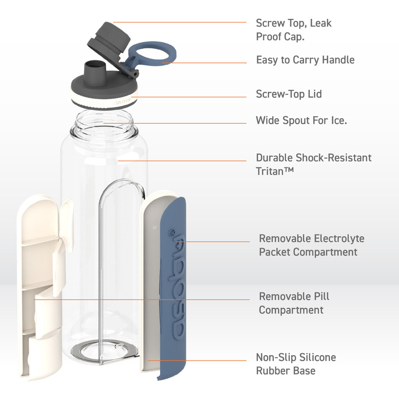 Butelka ASOBU Electrolyte ma specjalne pojemniki do przechowywania saszetek/tabletek z elektrolitami w proszku lub suplementów, które z łatwością możesz zamontować na butelce.