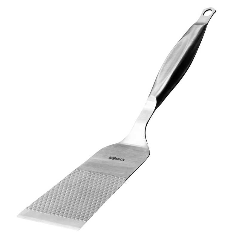 Narzędzie wykonano w 100% ze stali nierdzewnej, ma nieprzywierający i antypoślizgowy, diamentowy wzór na powierzchni roboczej co ułatwia obracanie, wkładanie i zdejmowanie potraw z grilla.