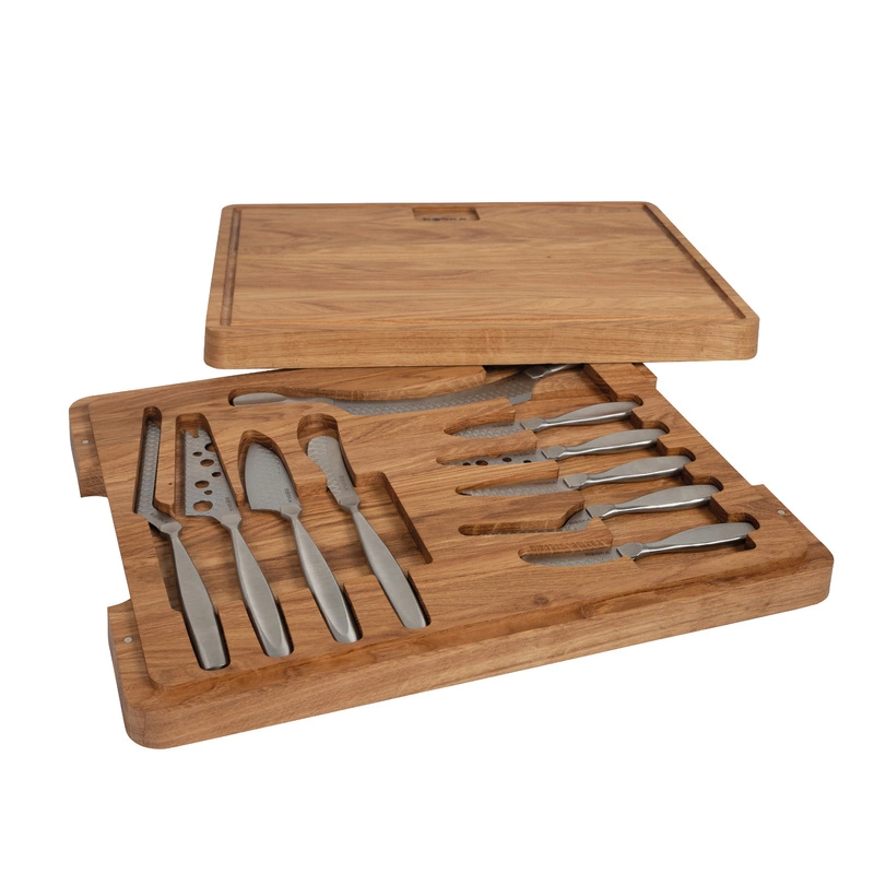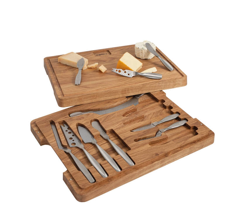 Drewniana deska składa się z dwóch części i została zaprojektowana tak, aby można było w niej przechowywać wszystkie noże do sera.