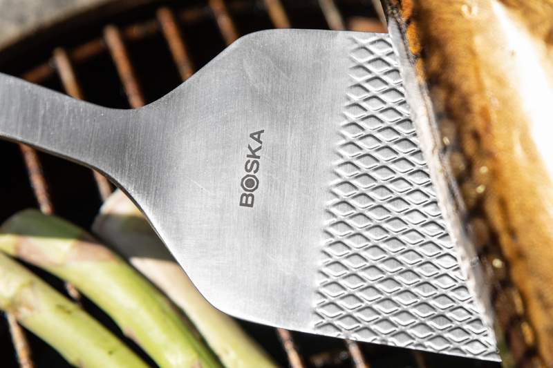 Łopatka do BBQ jest wykonana w 100% ze stali nierdzewnej, ma antypoślizgowy, diamentowy wzór zapewniający pewny chwyt przy obracaniu, wkładaniu i zdejmowaniu potraw z grilla.