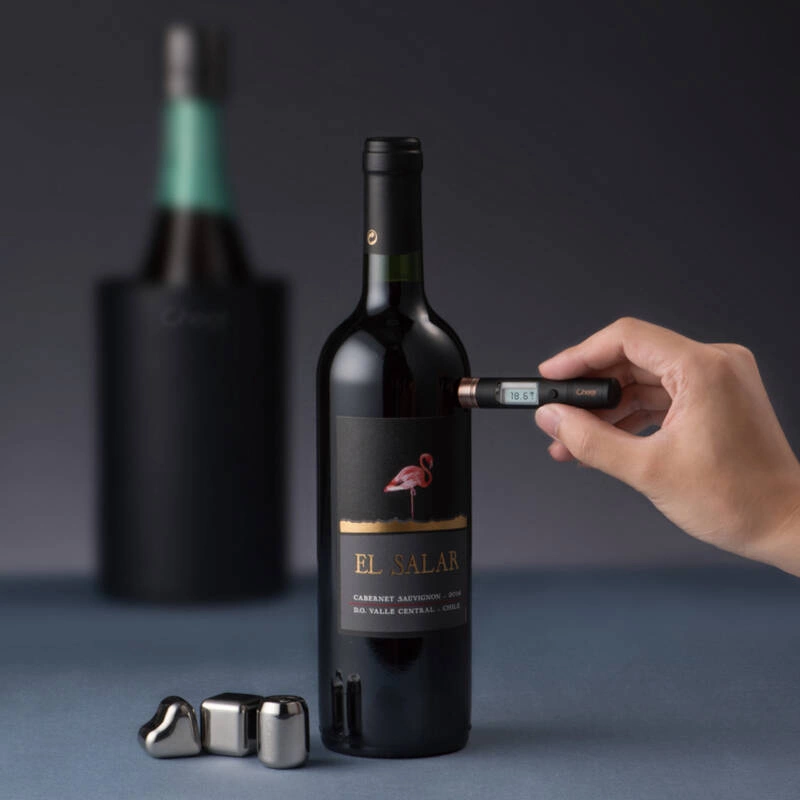 ThermoVin to dyskretny i kompaktowy termometr na podczerwień, który pozwala na natychmiastowe poznanie temperatury butelki z wysoką dokładnością bez otwierania jej.
