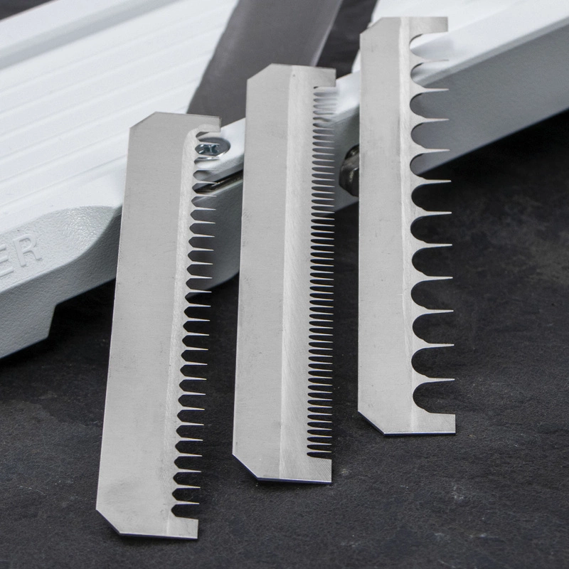 - Mandolina ma szerokość roboczą 6,4 cm i jest wyposażona w cztery ostrza z hartowanej stali: jedno płaskie o prostej krawędzi i trzy ząbkowane o różnych rozstawach ząbków.