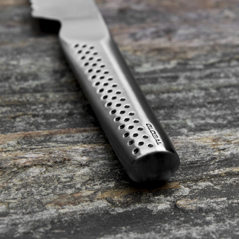 Praktyczny nóż kuchenny z ząbkowaną krawędzią tnącą, którym można pokroić każdy rodzaj pieczywa, nie przyciskając go nadmiernie do deski. Cienkie ostrze gładko przecina nawet najtwardszą skórkę chleba, a szeroka klinga zwiększa przestrzeń między palcami a powierzchnią do krojenia. Oryginalny nóż do pieczywa marki Global może też służyć do krojenia i podawania kanapek, pomidorów, ananasów oraz innych owoców z twardą skórką.