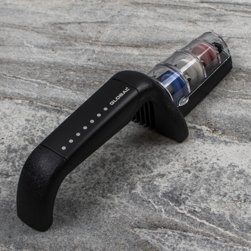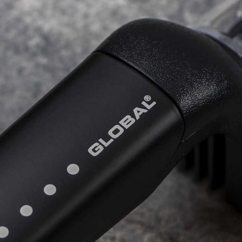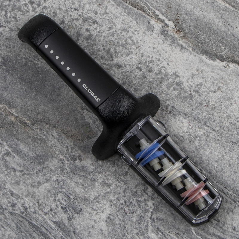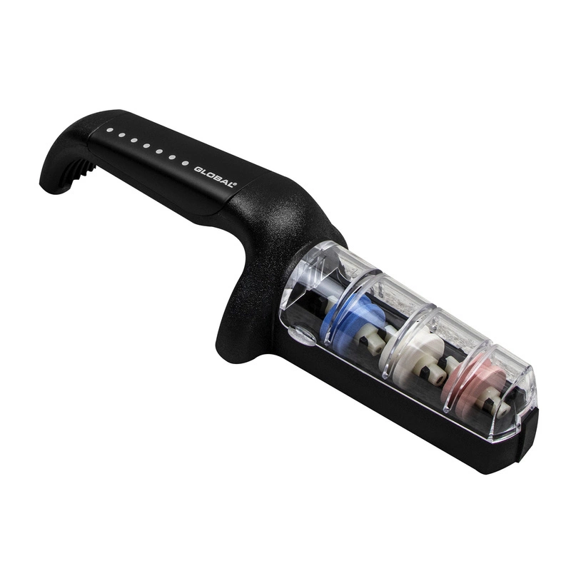 Trzyfazowa ostrzałka ceramiczna, zaprojektowana specjalnie dla noży Global i przeznaczona do ostrzenia wszystkich rodzajów noży, z wyjątkiem tych o szlifach jednostronnych, np. tradycyjnych noży japońskich. Dzięki wodzie proces ostrzenia przebiega szybciej, a fabrycznie ustawione otwory ułatwiają naostrzenie noża pod odpowiednim kątem. Gumowany uchwyt i podstawa mają właściwości przeciwpoślizgowe.