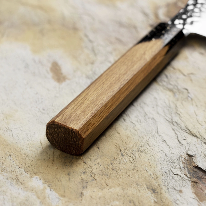 Japoński nóż typu Petty łączy w sobie funkcję noża uniwersalnego i noża do obierania, dzięki czemu znajduje wiele zastosowań w codziennej pracy. Ponieważ posiada stosunkowo szeroką klingę, świetnie się sprawdza przy wykonywaniu takich zadań, jak krojenie warzyw i serów, siekanie ziół czy usuwanie gniazd z owoców. Ostro zakończony nóż uniwersalny, którym można pracować nad deską, jest idealnym uzupełnieniem pełnowymiarowego noża szefa kuchni.