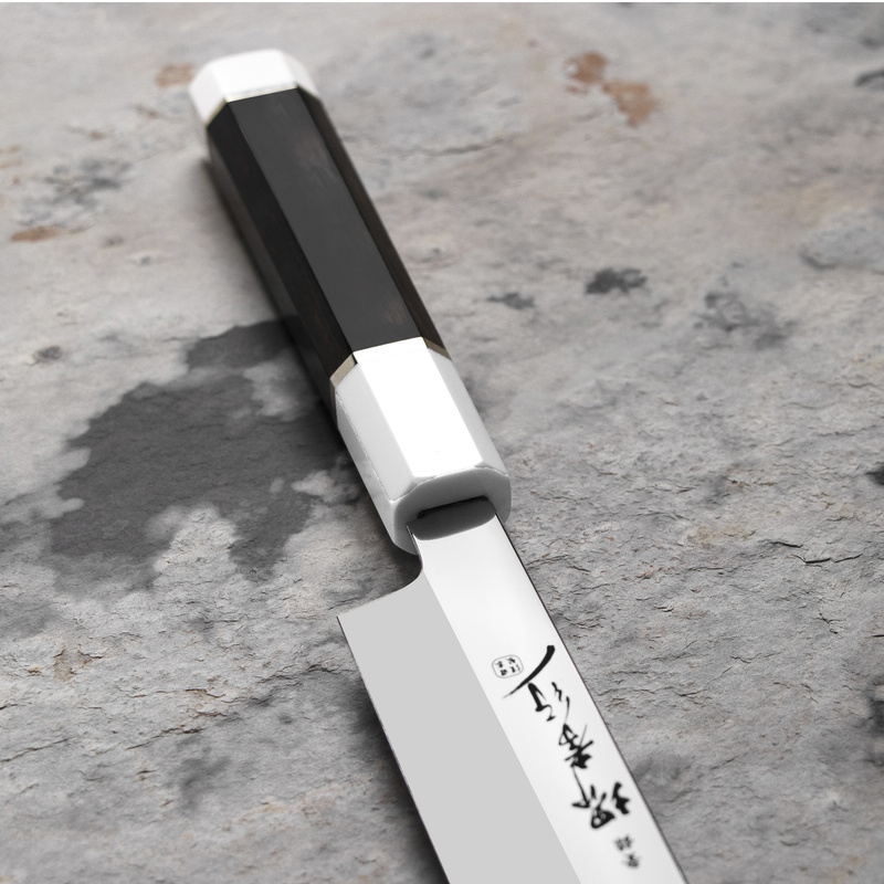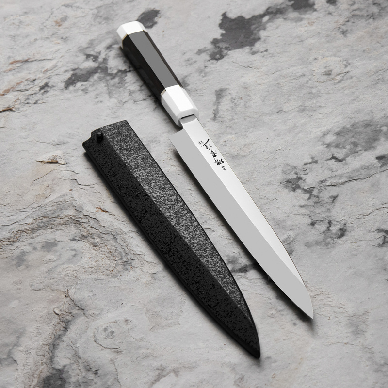 Nóż do sashimi (Yanagi) to tradycyjny japoński nóż, który służy do krojenia świeżych filetów na niemal przezroczyste plastry. Znakomicie się sprawdza podczas przygotowywania sushi, rybnego carpaccio oraz innych potraw z bardzo delikatnych składników. Długie, wąskie i sztywne ostrze zapewnia drobiazgową precyzję, a jednostronny szlif – czyste cięcie. Nożem Yanagi najlepiej wykonywać jednostajny ruch w jednym kierunku: do siebie.
