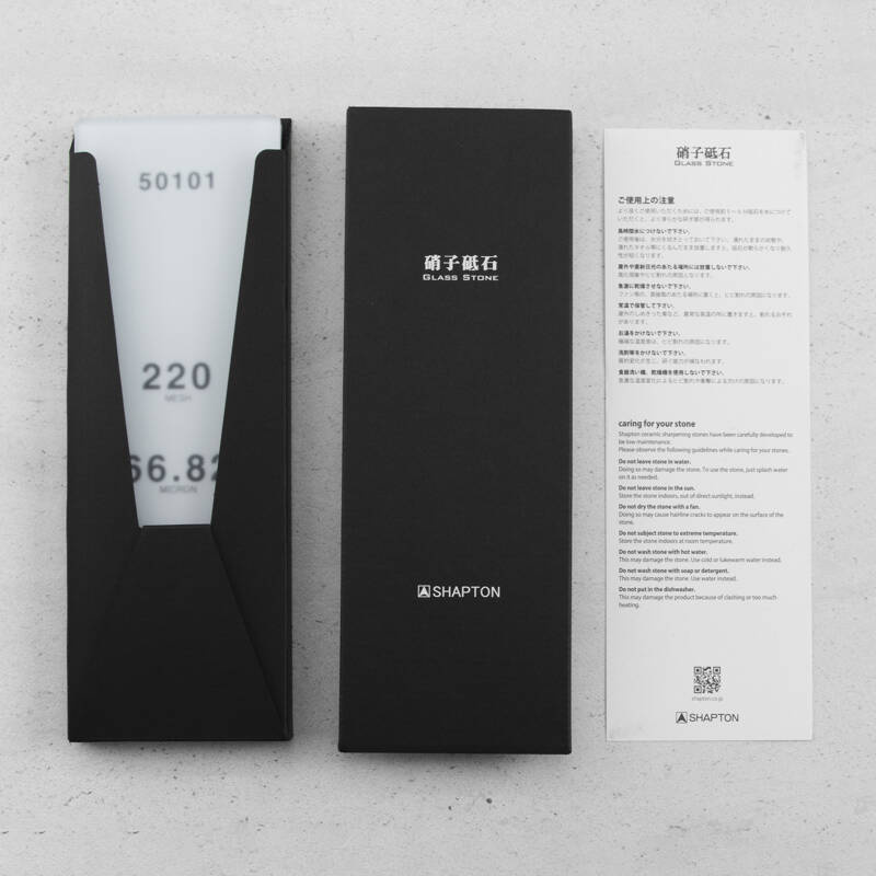 Kamienie Shapton z serii Glass to najnowocześniejsze rozwiązania w kwestii znanej ludzkości od tysięcy lat. Ostrzenie noży na kamieniach Glass, przebiega szybko I sprawnie. Do podstawy wykonanej z hartowanego szkła, przytwierdzany jest materiał ścierny – biały korund, jeden z najtwardszych minerałów na świecie, dzięki temu charakteryzują się widocznie dłuższą żywotnością niż tradycyjne kamienie. Kamienie Glass nie wymagają takiego przygotowania jak tradycyjne kamienie wodne, wystarczy przed ostrzeniem spryskać je wodą, bez długotrwałego przechowywania w zbiorniku.