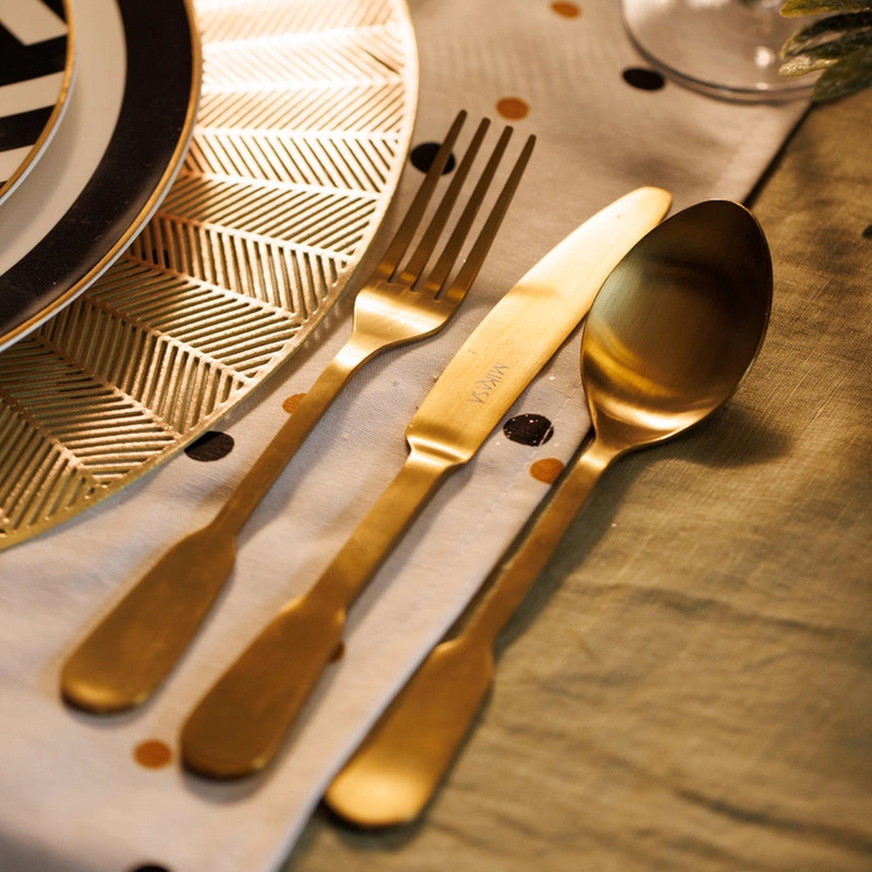 Komplet złotych sztućców Mikasa o prostym wzornictwie nawiązującym do okresu międzywojennego.