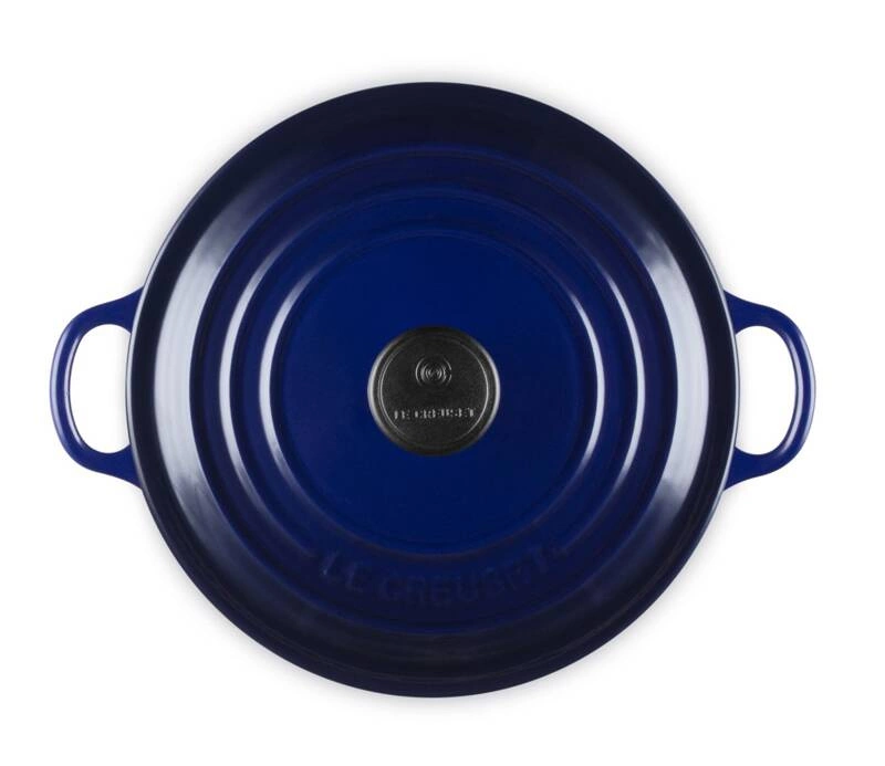 Emaliowany, żeliwny garnek / brytfanna francuskiej firmy Le Creuset średnica 20 cm o pojemność 2,4L. Uniwersalny praktyczny średni rozmiar garnka w limitowanym kolorze Indigo.