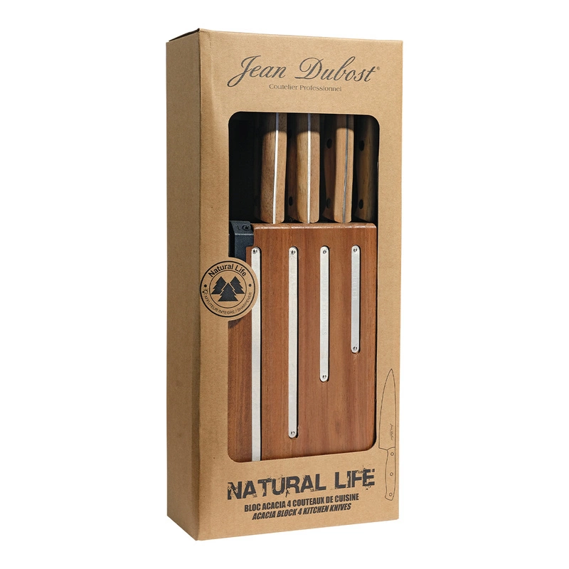 Jean Dubost - Blok z 4 nożami kuchennymi i ostrzałką - drewno akacjowe