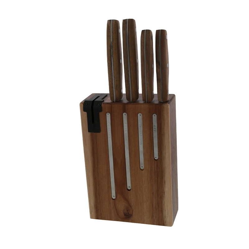- Blok na noże z drewna akacjowego z zintegrowaną ostrzałką do noży. Minimalistyczny design i ciepło drewna sprawdzi się w wielu wnętrzach. Blok posiada 4 blaszki z opisem noży, dzięki temu bez problemu umieścisz je w dedykowanym dla nich miejscu.