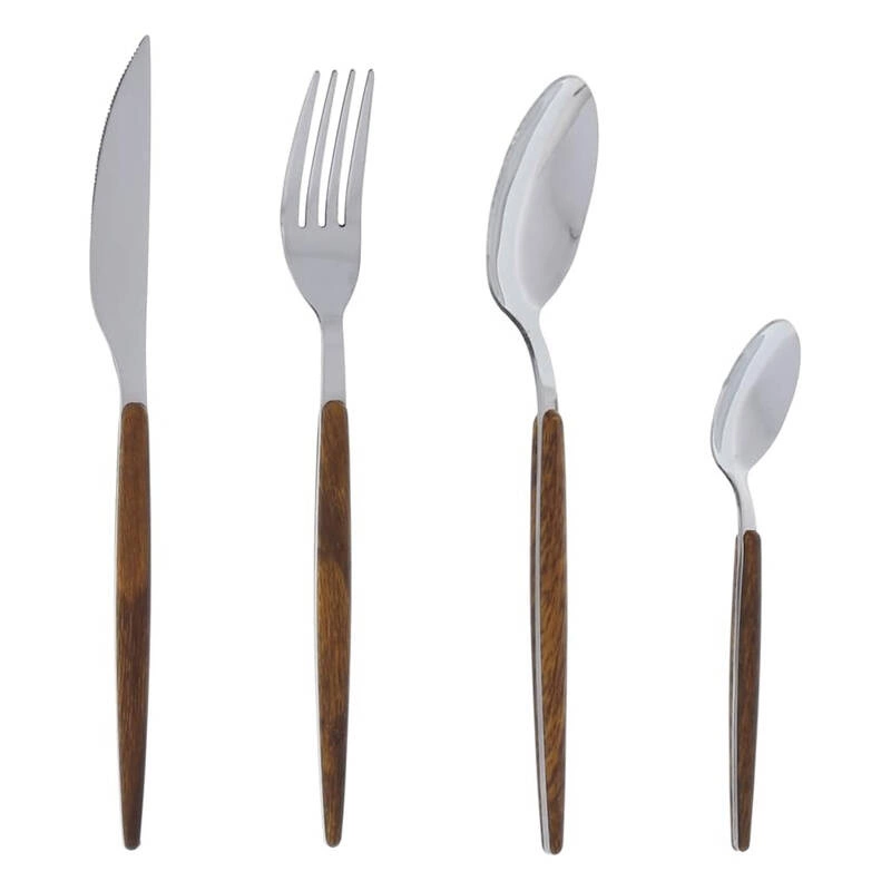 Rączka sztućców jest wykonana z tworzywa o imitacji drewna orzechowego. Miękka i subtelna linia sztućców wpasuje się w minimalistyczne wnętrza. Wyjątkowy podłużny i wąski kształt będzie stanowił stylową i elegancką ozdobę stołu.