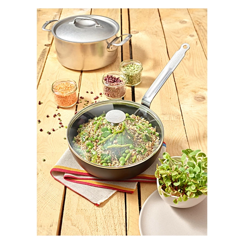 Seria CHOC INTENSE wyposażona jest w dno ze stali nierdzewnej, dzięki czemu patelnie są kompatybilne ze wszystkimi rodzajami kuchenek, w tym indukcyjnymi. Nitowany uchwyt ze stali nierdzewnej zapewnia stabilny chwyt i elegancki wygląd, który doskonale wpisuje się w nowoczesny styl kuchni.