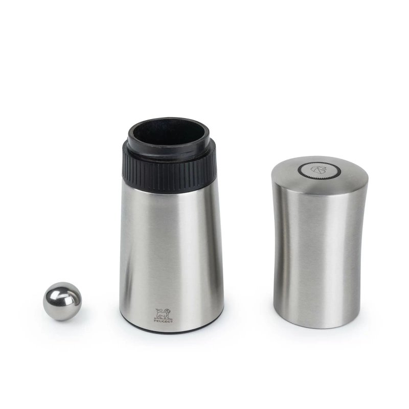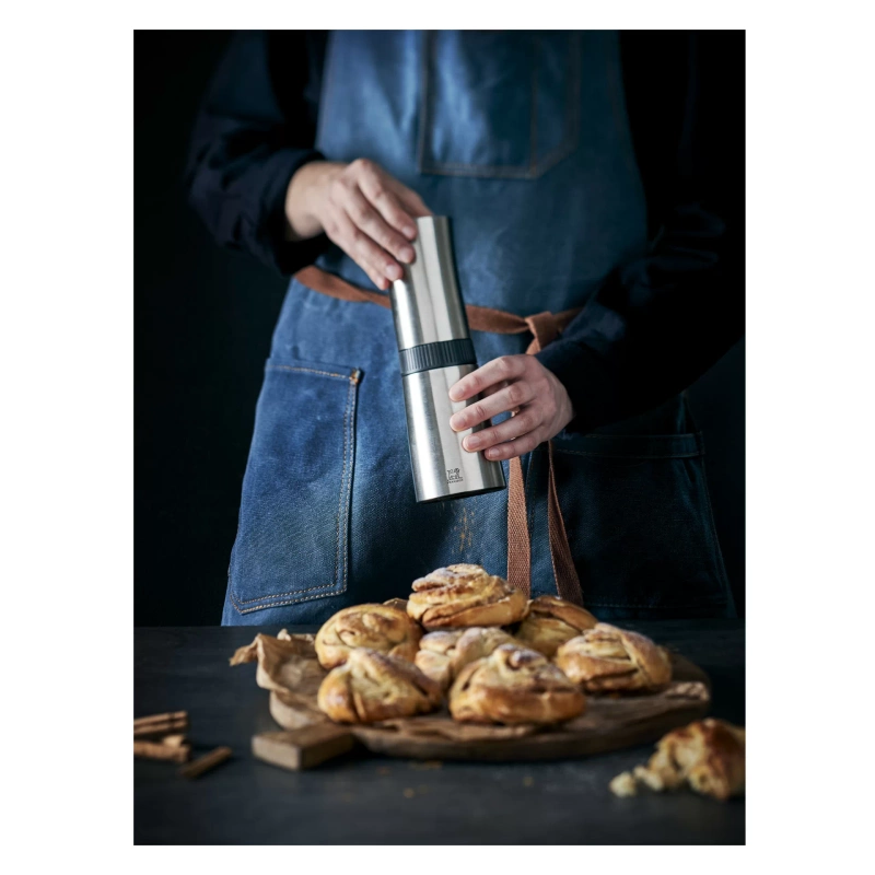 Innowacyjna konstrukcja łączy funkcję shakera i młynka – najpierw rozdrabnia laski cynamonu, a następnie precyzyjnie je mieli w stalowym mechanizmie.