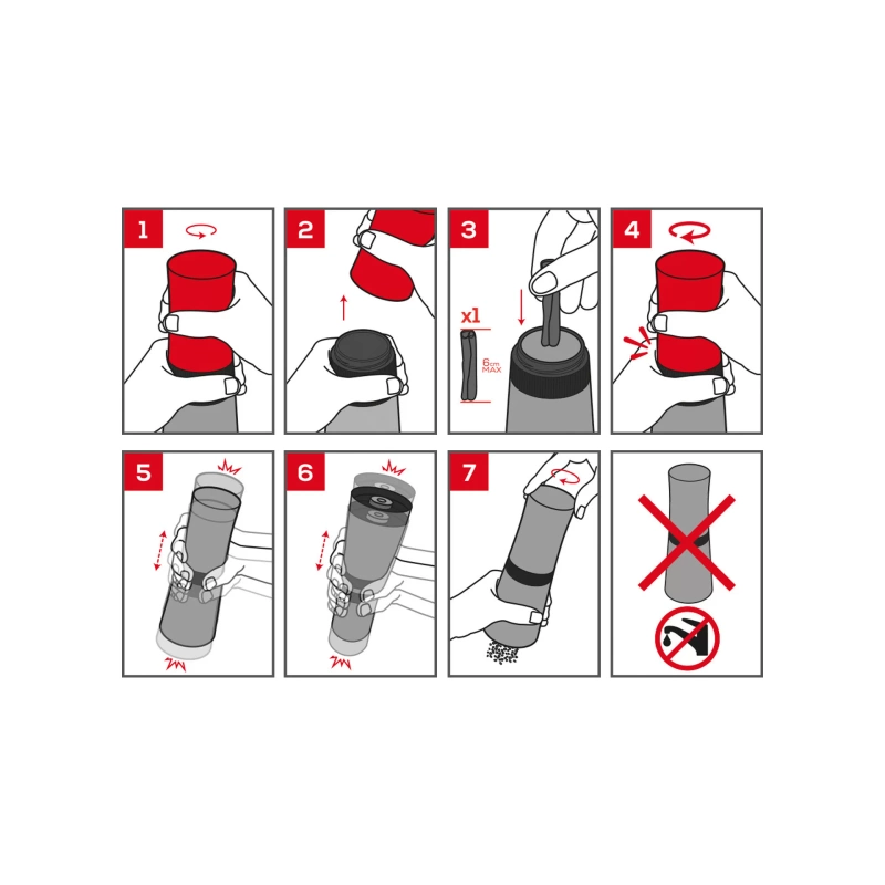Aby z niego skorzystać, wystarczy odkręcić górną część, umieścić w środku laskę cynamonu (maksymalnie 6 cm długości), zakręcić i energicznie potrząsnąć urządzeniem w pionie. Stalowa kulka w środku rozbije cynamon na mniejsze kawałki. Następnie, obracając górną część młynka, można uzyskać świeżo zmielony cynamon o intensywnym aromacie, który doskonale wzbogaci smak potraw i deserów.