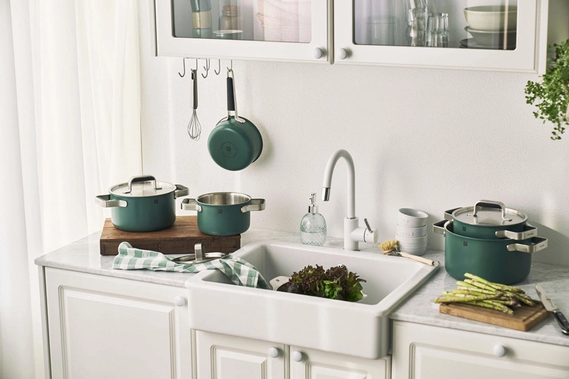 Patelnia ZWILLING Pure w eleganckim zielonym kolorze łączy nowoczesny design z wysoką funkcjonalnością. Jest to pierwsza patelnia ze stali nierdzewnej o trójwarstwowej konstrukcji, pokryta ceramiczną powłoką zewnętrzną, zapewniającą równomierne przewodzenie ciepła i doskonałe efekty smażenia.