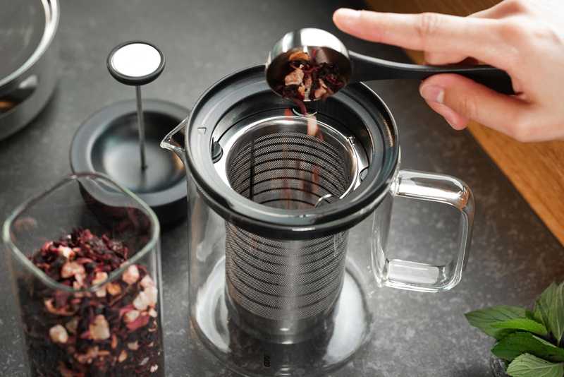 • Po zakończeniu parzenia wystarczy wcisnąć tłok, by zatrzymać parzenie i pozbyć się liści herbaty w bezpieczny sposób
