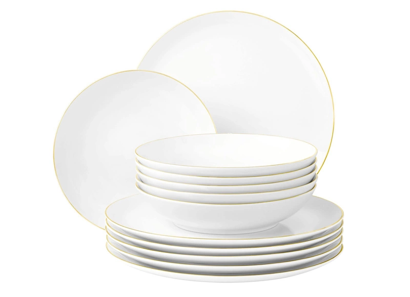 Komplet naczyń z kolekcji LIBERTY, ozdobiony złotą linią, to wybór, który sprawdzi się przy każdej okazji, wprowadzając uroczysty akcent na Twoim stole. Zestaw, składający się z 6 talerzy głębokich i 6 talerzy obiadowych, zachęca do celebrowania ważnych momentów w gronie najbliższych.