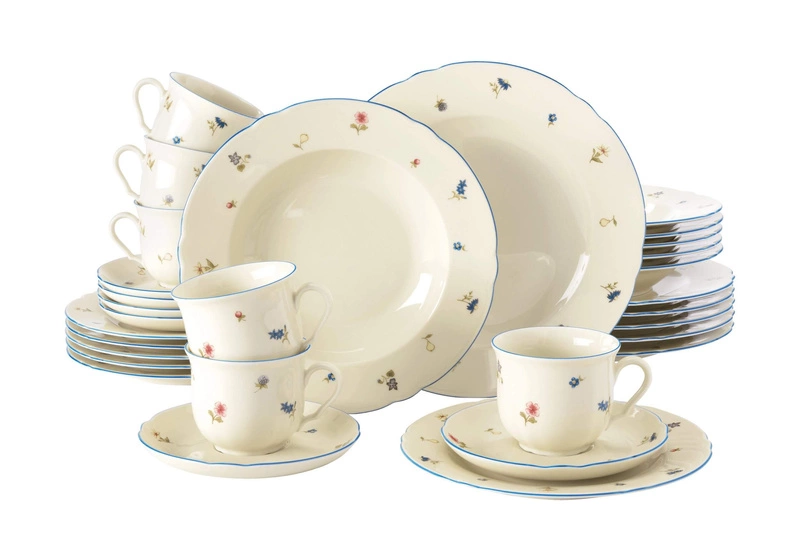 Seltmann Weiden oferuje elegancki, 30-częściowy zestaw porcelany z serii Marie-Luise Streublume, idealny dla 6 osób. Kolekcja Marie-Luise charakteryzuje się klasycznym, romantycznym wzornictwem z subtelnymi, rozsypanymi motywami kwiatowymi (Streublume). Kremowy odcień porcelany oraz delikatne, pastelowe zdobienia nadają zastawie wyjątkowy, ponadczasowy charakter.
