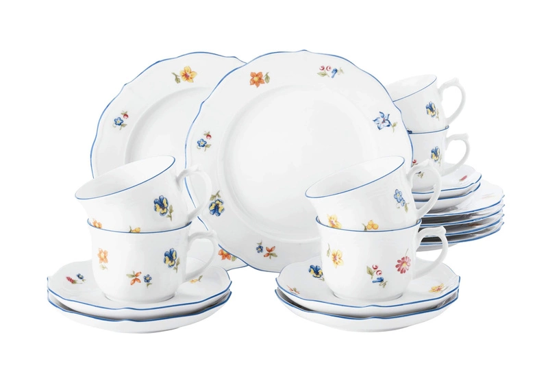 Porcelana w odcieniu czystej bieli została udekorowana romantycznymi polnymi kwiatami, które nadają zestawowi subtelności i ciepła. Niebieska obwódka oraz falowane brzegi podkreślają klasyczny, a zarazem lekki charakter kolekcji. Staranność wykonania gwarantuje estetykę i trwałość przez długie lata.