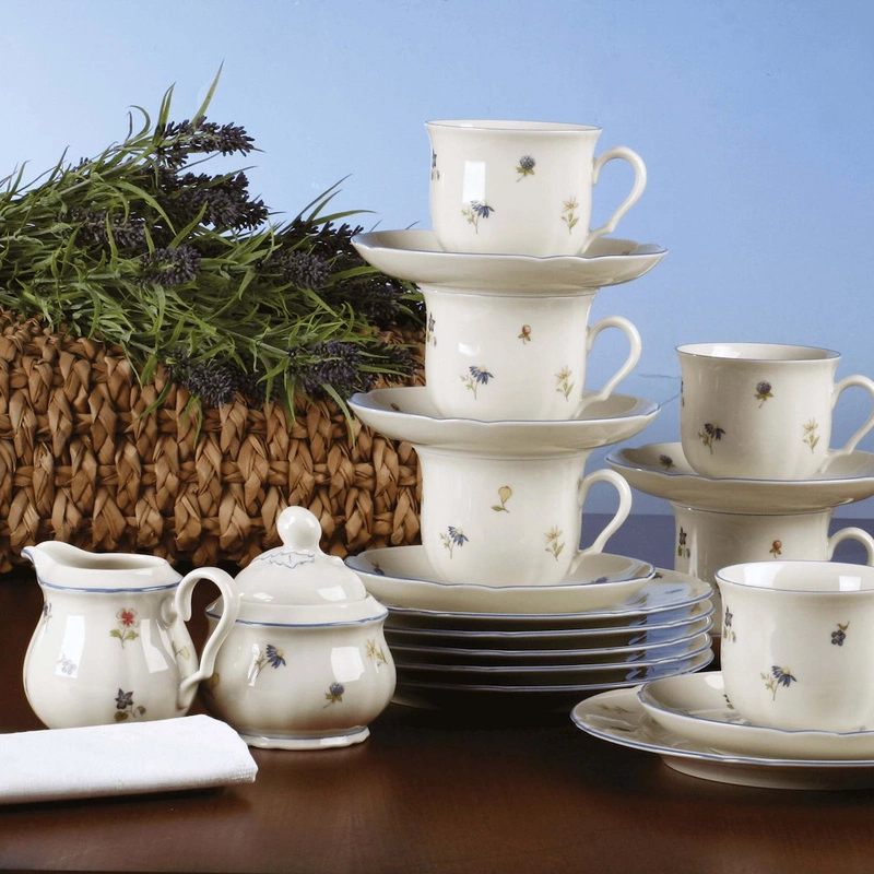 Powierzchnia talerza w odcieniu kości słoniowej została ozdobiona wielobarwnym motywem polnych kwiatów, które tworzą na stole niezwykle ciepłą i przytulną atmosferę. Delikatna, niebieska obramówka dopełnia jego klasyczne piękno, przypominając o tradycjach domowych posiłków w gronie najbliższych.