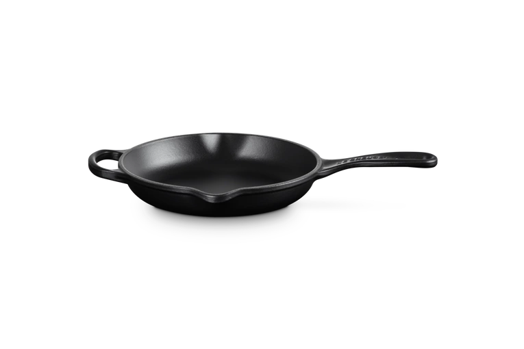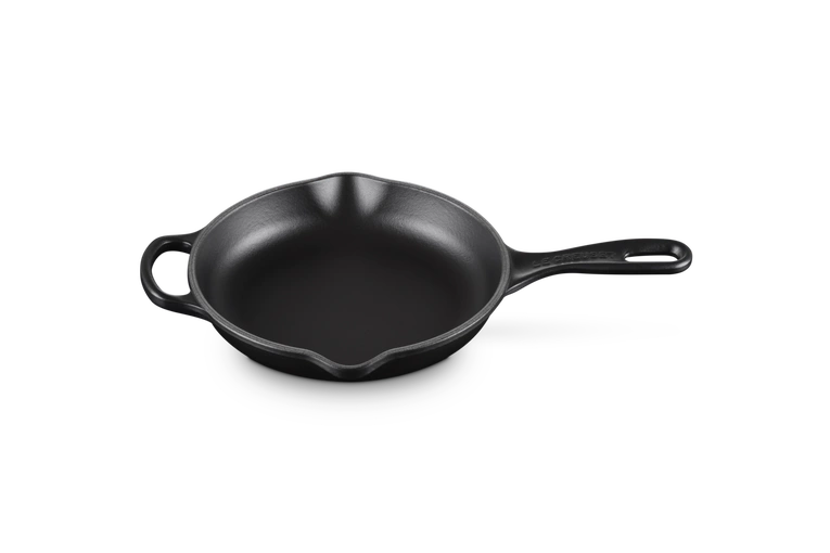 Żeliwna patelnia Signature Le Creuset 20 cm emaliowana kolor Czarny do smażenia i serwowania. Wyposażona w uchwyt żeliwny zapewniający bezpieczne przenoszenie, jednocześnie można naczynie używać do zapiekania w piekarniku. Dwie wylewki zapewniają wygodne wylewanie płynów i sosów.