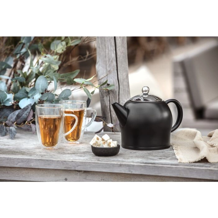 Dzbanek termiczny trzymający temperaturę herbaty wykonany jest z nierdzewnej stali z czarnym wykończeniem. Izolacja termiczna utrzymuje temperaturę napoju przez co najmniej godzinę. Przeznaczony dla 4-6 osób. Wykonanie dzbanka o takiej jakości wymaga ponad 100 różnych etapów procesu wytwórczego i wyjątkowego kunsztu rzemieślniczego. Uchwyt się nie nagrzewa, dzięki czemu używanie dzbanka jest bardzo bezpieczne. Zapakowany w prezentowe pudełko. Nie można myć w zmywarce. Do dzbanka można dokupić odpowiedni filtr/zaparzacz do parzenia mieszanek liściastych.