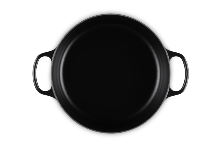 Klasyczny żeliwny garnek z niskim rantem i szerokim dnem. Idealne naczynie do gotowania sosów, risotto, pieczenia.